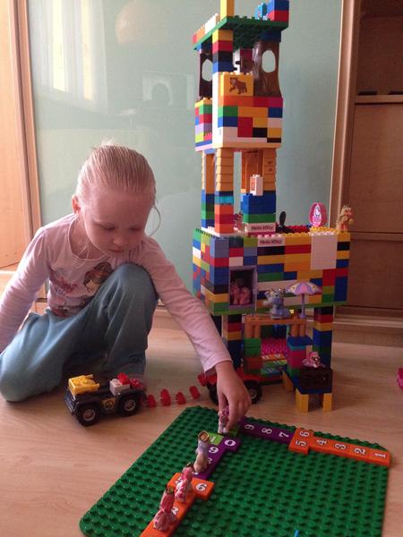 S počty teprve začínáme, ale do pěti už s pomocí Duplo kostiček umí Zuzka s přehledem. V čem je ale přebornice největší je stavění výškových budov 😀 Aktuálně v deštivém poledním klidu sama postavila rozhlednu pro zvířátka.