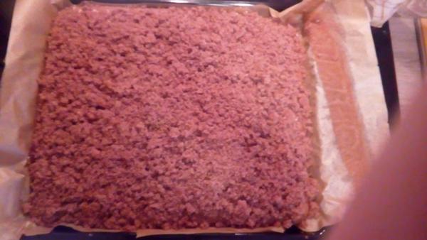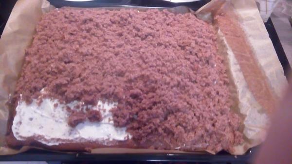 Těsto rovnoměrně rozetřeme na vyšší vymazaný a vysypaný plech (36x28 cm). Upečeme (180°C, cca 25-30 minut) a necháme vychladnout.