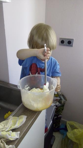 Krtkův dort na plech:těsto: 2 hrnky hladké mouky, 1 hrnek cukru, 2 vejce, 1 hrnek oleje, 1 hrnek mléka, 1 prášek do pečiva, 3 lžíce kakaového prášku, špetka soli