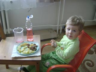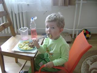 Holky, teď zírám, Honzík si zabavil jednu židli od jídelního stolu, nechal si dát papání na talíř a prý, že "stolovat, stolovat" a papá sám, umí si jídlo napíchnout pěkně na vidličku a už se cpe a je spokojenej a já taky, že se normálně najím 😀 😀