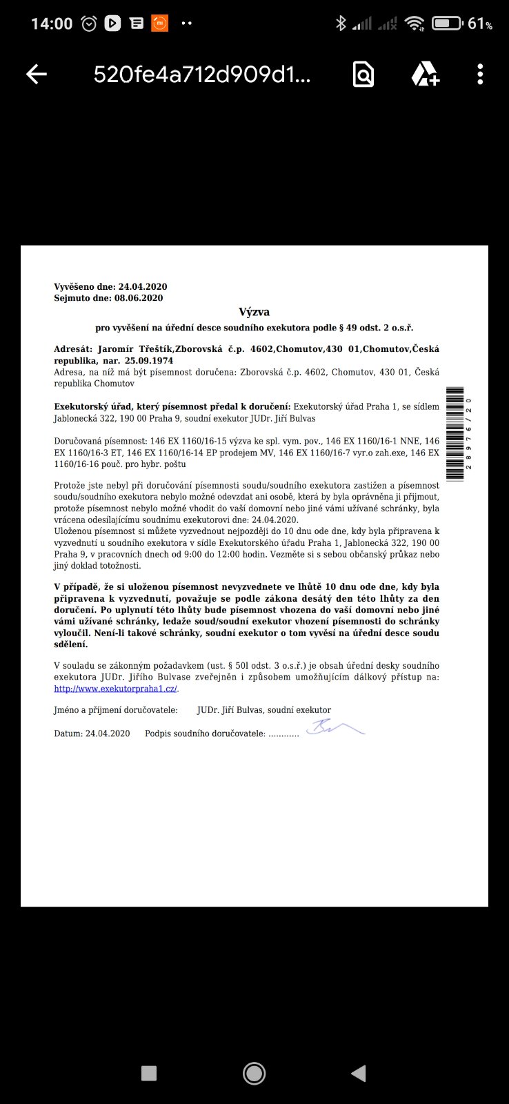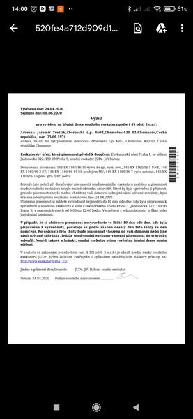 Adresa místa bydliště na dopise od exekutora je Magistrát Chomutova.