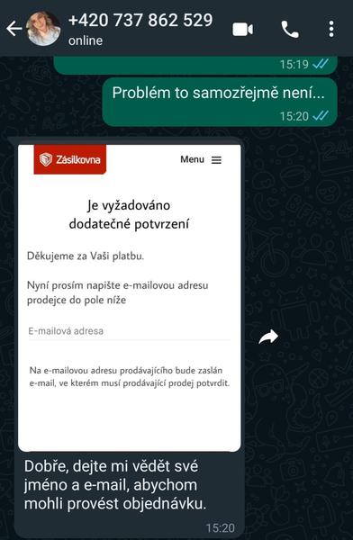 Dnes v 7:06 mě na whatsapp kontaktovala ženská, která měla uvedené celé křestní jméno i příjmení - takových, jakých se jmenuje kde kdo. Na profilové fotce byla rodinná fotka, s manželem a dvěma malýma dětma. Takže působila důvěryhodně. První, co mě zarazilo, bylo, že píše tak brzy ráno v sobotu. Já už sice byla dávno na nohách, ale i tak. Prostě mi to přišlo divné. Pak po mě hned chtěla, že to chce poslat přes Zásilkovnu tímto způsobem - viz foto.