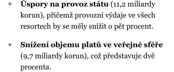 Souhlasim s uspornymi opatrenimi. Ale.. Za me klidne chlast, cigara, limonady, chipsy atd.. Zdaneni 50% a vic klidne :D Zamerit se na ty, co "nikdy nepracovali". Prehodnotit cely system ruznych tech soc. davek. Misto prispevku na dite to dat jako slevu na dani. Zabranovat tunelum statnich zakazek.. Bylo by toho hodne, kde se da lepe hosposarit.. Ano, poslanci udelat nejake to gesto vuci lidem, ze si taky jako sahnou na platy.