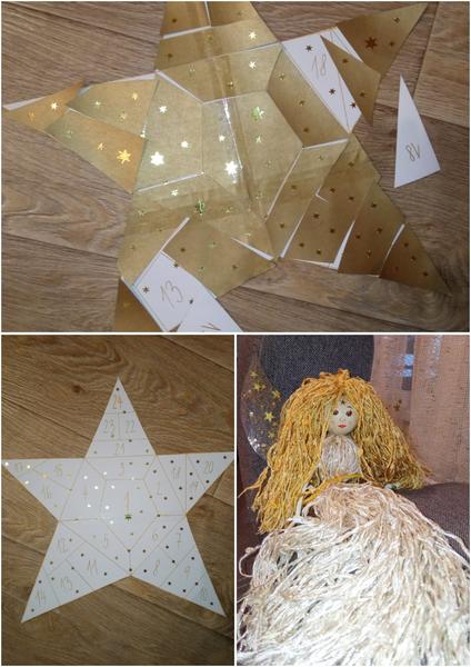 Zároveň jsem jim vyrobila vílu Třpytěnku a taky papírovou hvězdu, která bude viset na dveřích. Každý den bude Třpytěnka někde schovaná (lustr, záchod...) A bude mít u sebe jeden střep a ony si ho budou lepit na ty dveře, až bude na Štědrý den hvězda zase celá.