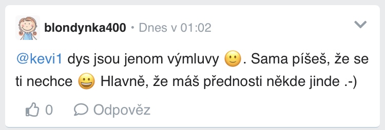 @klokanka31 Jenže někdy tu máš takové hovadiny že i s velkým sebezapřením se prostě neudržíš a napíšeš, protože to nutkání tu hovadinu rozporovat a uvést na pravou míru je neutuchající a ruku na srdce, každá z nás tu udělala přešlap který ani nemyslela zle jen potom blbě vyzněl (písemná komunikace je prostě sfiňa) a tazatelka nebo diskutující se do ní pak opřeli a tím se logicky strhne bitka, kdy ty hájíš svou pravdu a nakonec vlastně sama sebe proti osobním útokům, zatím co ostatní metají kamení...
