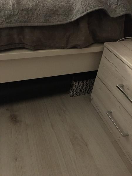 Papírová krabice pod postelí 😁 Hned vedle je podložka na cvičení a to asi svádí pohled víc 🤷‍♀️
