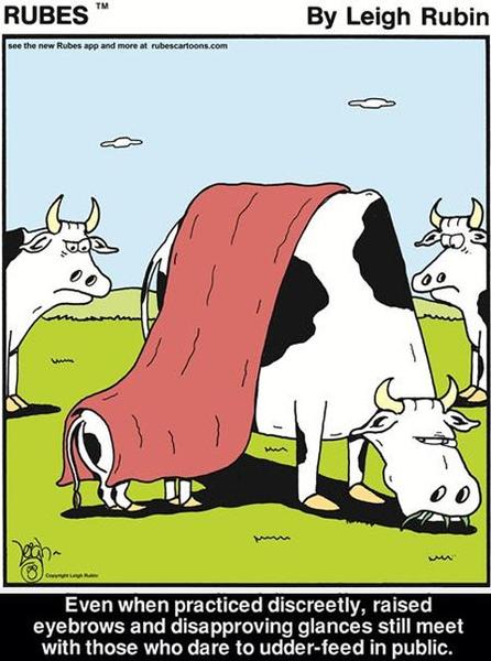 "I když provozováno diskrétně, i přesto ty, které se odváží veřejně kojit (z vemene), provází zvednutá obočí a nesouhlasné pohledy."