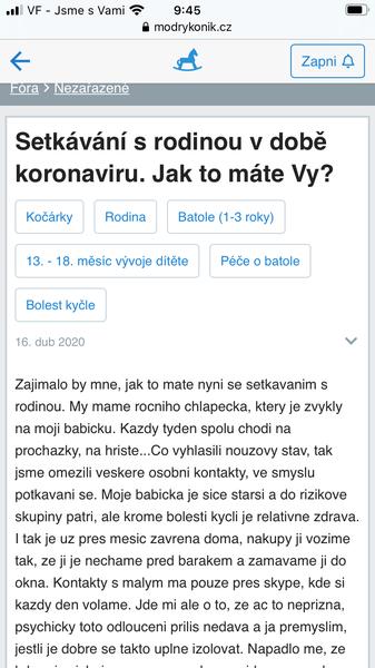 @evytra Nečetla jsem všechny komentáře. Ale my to máme, tak ze s mými rodiči se vídáme stále. Bydlíme ve stejné vesnici a chodime k nim na zahradu. U mé 80 babičky jsem byla 2 × sama bez dětí. A u manzelovych rodičů, které má 100 km daleko byl sám a to jeste z důvodu rodinného pohřbu. Ale ted jsme se bavili, že uvidime podle situace a možná bychom začátkem května k manzelovym rodičům na jeden den sjeli i s dětmi.