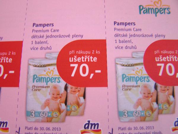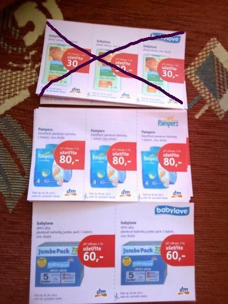 mam kupony do 30.6.2013 pleny Pampers Premium Care vel. 3 se slevou 70kc -9ks, Pampers newbaby vel. 2 se slevou 80kc -6ks, pleny Babylove vel. 2 se slevou 30kc -2ks, vlhcene ubrousky Huggies se slevou 50kc -3ks, BABYLOVE-krem panthenol sleva 10kc 1ks, pecujici krem sleva 10kc -1ks, myci emulze sleva 10kc -1ks, bio fenyklovy caj sleva 10kc -2ks. SEBAMED- krem proti opruzeninam sleva 30kc 1-ks, detske ubrousky saleva 40kc -1ks, extra jemny krem sleva 40kc -1ks, intimni myci emulze sleva 40kc -3ks.