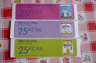 Já bych brala na čaj hipp,na pěny do koupele jakékoliv,na příkrmy babylov a hami,na přebalovací podložky,ubrousky babylov,plenky od 9kg,hami mlíko 2,těl mléko johnson nebo hipp.