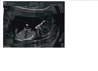 Idem na vás naprskať trochu tehu bacilov. Dnes som bola na KO, všetko je v pohode, mimčo na mňa mávalo. Minulý týždeň sme mali NT screening...Bolo to naozaj super vidieť mimino na takom kvalitnom utz. Mimi najprv spalo, ale ako doktorka začala jazdiť hore dole sondou, tak sa zobudilo a začalo sa strašne vrtieť, že ho skoro nemohla zmerať 🙂. Pravdepodobnost na vadu nam vysla 1:50 000 a doktorka na zaver skonstatovala, že by chcela na utz vidieť samé také zdravé miminá, ako je to naše...Prikladám fotečku.