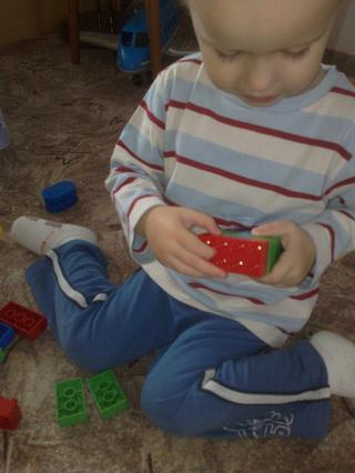Lego, už mu to jde docela slušně...ta jemná motorika se zlepšuje, je to vidět každým dnem...když mu říkám, kam má, co dávat...tak už je schopnej fakt postavit něco smysluplnýho, ne jenom komín 😉