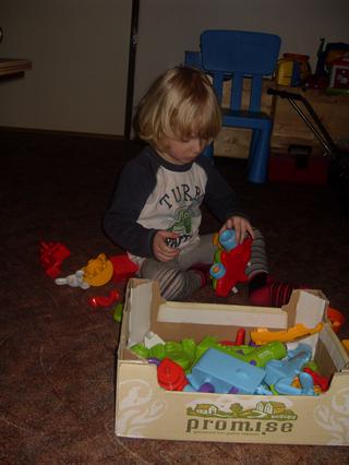 pak dřevěné puzzle na souvislosti a čísla, zatím to dával jenom k sobě..a já jsem mu říkala, co tam je..a počítali jsme si a ukazovali na prstech...