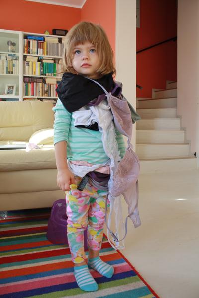 Jo a máme nějakou éru oblíkání teďka. Ovšem oblíká si pouze ponožky a moje kalhotky a podprsenky a to tak, že si to oblíkne kolem pasu nebo na krk 😝 😝 😝 Tohle foto je slabý, je schopná mít na sobě těch podprsenek mnohem víc a k tomu tatínkovy ponožky ke kolenům, případně jednu nohu v punčocháčích a tahá zbytek punčocháčů za sebou...