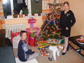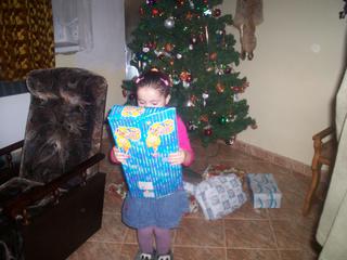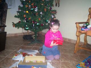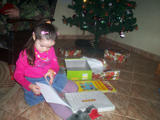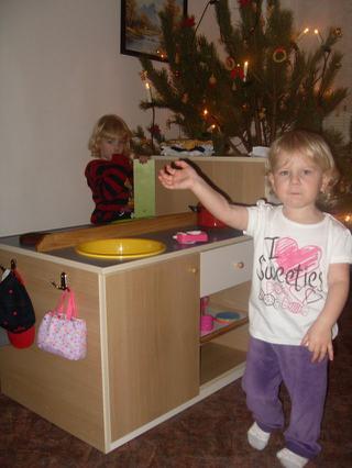 Kati s nadsenim vesala ozdoby na stromcek. zjedla celu veceru, a ked sme isli na balkon s prskavkami aby Jezisko ku nam trafil, ja som medzitym pohadzala darceky pod stromcek. Katiku prvu omrzeli prskavky, vratila sa do obyvacky a kludne dalej vedla darcekov pozerala rozpravku, ani si nevsimla ze tam su. Myslim ze preto ze nic ani necakala, z minuleho roku pamatova stopa nula, a teraz sme jej nejak zvlast nezdoraznovali ze pridu darceky, nejak tomu ani nechapala kym to nevidela. Az ked sme ju upozornili zacala rozbalovat. Tesila sa z hlavne z lega Helou Kitty, lego je u nasich deti vobec hrackou c. 1, mame uz toho aspon 6 skatul a dalsie dva este nevybalene. Na didakticke knizky a puzzle ani nekukla, proste nezajem. Este ju chytila interaktiva myska na baterky, taka blbina ale starsia si to priala a vedela som, ze Katiku by urvalo, keby to nemala tiez.