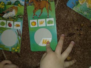 Co papají zvířata - nic moc, jenom se přiřazuje podle kartičky jídlo do kruhu...