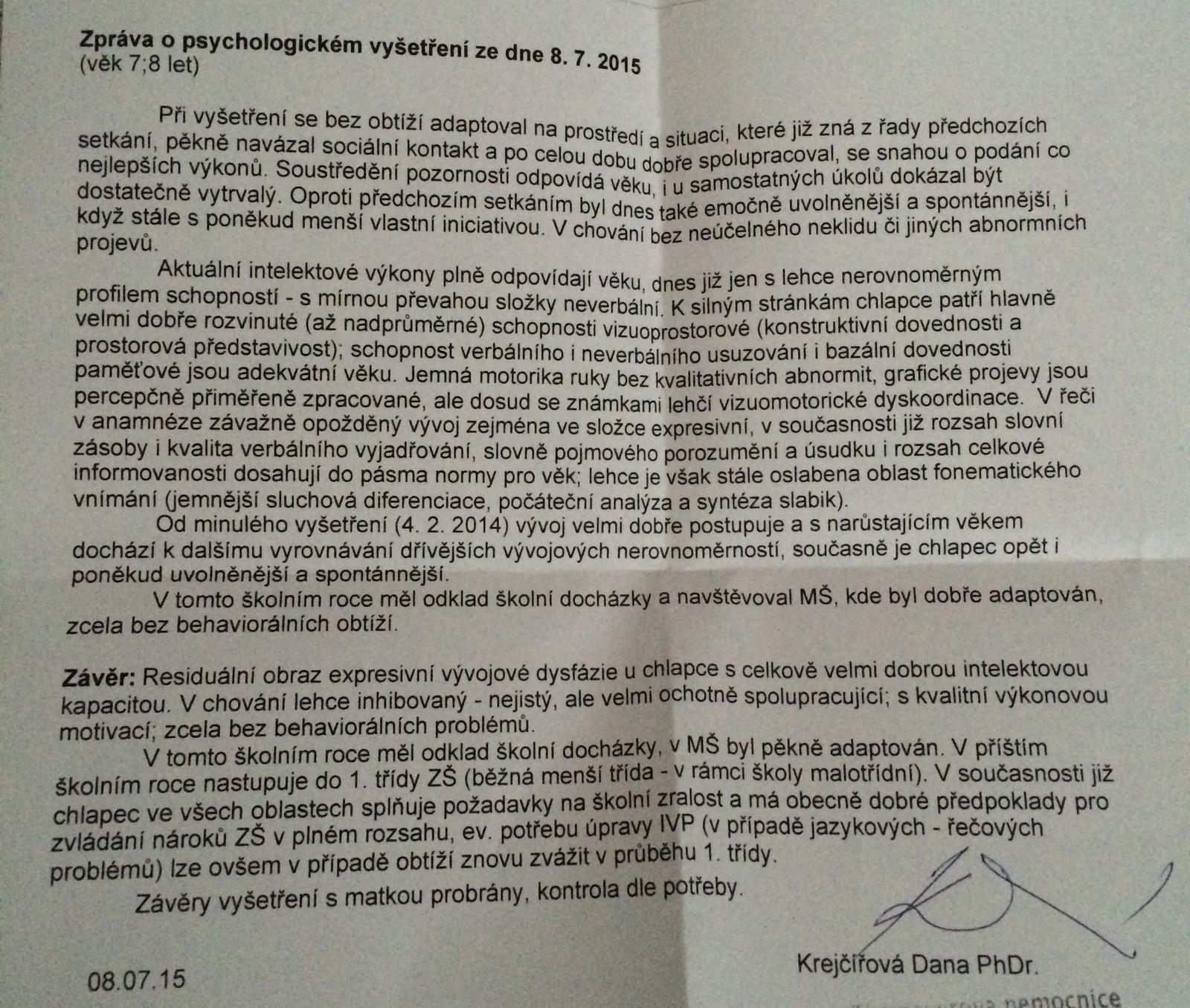 My teď byli u známých ve Vídní. Známá se učí česky a umí fakt skvěle (kdybych já uměla tak anglicky, jako ona česky, tak budu spokojená 😀 ). Byla nadšená ze staršího, jak mluví, roměla mu. A ti známí mají dva vnuky a oba dva mají "speech problem". Dle popisu by to na dysfázii sedělo. Starší vnučka asi stejně stará jako náš starší má 3x týdne logopedii a jednou týdně ergoterapii a prý stejně jde hrozně pomalu dopředu. Navíc je tam nevýhoda bilingualní rodiny, Rakušák + Filipínka, kdy maminka neumí pořádně neměcky, takže vyjednávání u doktorů zvládá špatně atd. A jestli jsem to pochopila dobře, tak v Rakousku nemají institut odkladu školní docházky, prostě, kdo má jít do školy, tak jde ... Docela to bylo zajímavé, jak je to zavedeno jinde.