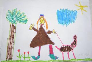 Kati ma aj velmi dobre to 3rozmerne priestorove vnimanie, trebar nakreslili s Johi podobny obrazok, Johanka nakreslila dievcatko na koni, tvar z profilu ale trup a nohy z predu, obe nohy "viseli" z boku kona, kresba je inak presnejsia, puntickarsky vymalovane nic nezachadza za ciaru.