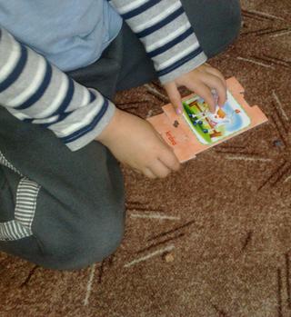 Ten zajíc v pytli - třeba zrovna s tužkou to dělá, že píše, brýle si dává na noc, s nůžkama dělá že stříhá, to chápe. Jinak jeho to baví, nosí si to někdy sám a vydrží komplet na všechny obrázky. Ale jak jsem psala, jen když má náladku.