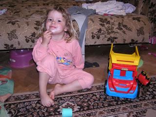 Lukášek má mnohem lepší sebeobsluhu, než jsme měli my. Přes den bez pleny až v necelých 3 letech (opět o Vánocích 😉 ). Odpor k dodržování režimu, jíst sám uměl, ale nechtěl. Oblékání bylo takové nanic. Spíš nechtěl. A to je moc důležité, že je Lukášek v tomhle samostatný. Asi to bude těmi jeslemi, ale i tak. Náhodou je to šikulka. Máte přece jen něco přes 2,5 roku. Do