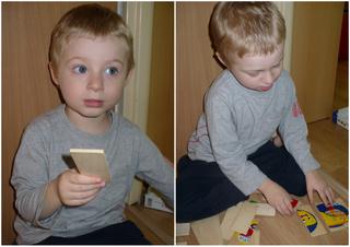 Jinak taky špatně drží tužku, zřejmě bude levák a puzzle má rád. Složí ze 3 dílků a teď jsem mu na narozeniny koupila puzzle s bořkem, takový box, kde jsou celkem 4 puzzle, 2x 24 dílků a 2x něco přes 30. A baví ho to, snaží se, poskládá jen bořka a spol., ale to okolí jako nebe apod. mu zatím nejde. Puzzle, které se má složit na obrázek, poskládá během chvilky.