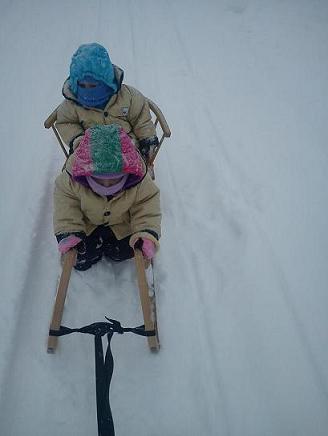 Chodíme na sáňkách tam a zpět po ulici. To nám na tu půlhodinu stačí 🙂