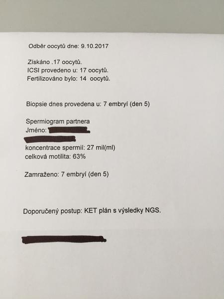@rosalline No to je supr výsledek,gratulace.👍😊 Řekla bych, ze sesmolili protokol dnes na nějaký předem daný mustr, protože o víkendu nikdo nebyl, ale bioptovali v sobotu. Ze by jich zbylo 14, to snad ani není možný,fakt statisticky cca polovina odpadne při kultivaci. Určitě nevyhodi dobrá embrya jen tak, bez toho,abyste souhlasili. Pokud chce někdo proplatit pgs na pojistovnu,tak čerstvý transfer není bohuzel možný.