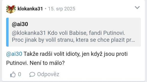 @ai30 nepotřebuju vysvětlení, mě je celkem jedno tvé smýšlení. Ja se jen pozastavuji nad tím, ze voliči, Lide s názorem jako máš ty, všude hlásají jak je druha strana tupá, ale jejich projev velmi často spadá pod morální dno. I kdyby druhá skupina, s odlišným názorem, volila mimozemšťana, je to jejich názor a ty nemáš právo je nazývat idioty. Ta proti Putinova strana hlásá jak ke inteligentní, ale co výrok, tak urážka proti strany, směšné. A opravdu se mým komentář vyhni k soudům koho budu volit ja, spletla by ses, jde mi pouze a jen o projev, který je většinou velmi vulgární a pro mě směšný, když melou jak jsou vzdělaní. Ale to asi nebudeš chtít pochopit. Popřeji krásný den