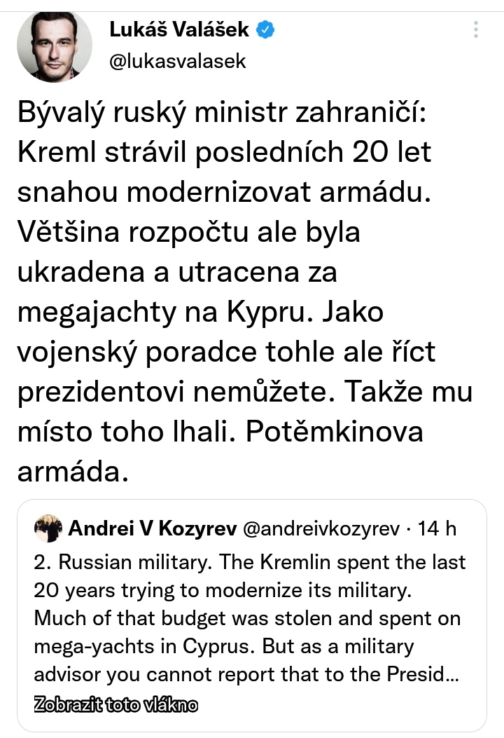 @estelle777 No naši se k tomu staví úplně stejně jako já. Ale ono je to daný taky tím, že táta je historik, že Rusko zaútočí říká už pár let, že k tomu směřuje hodně indicií, hodně to sleduje, poslední rok říkal že přituhuje a určitě to přijde. Musím říct, že mě strašně překvapilo, že teď čtu spoustu analýz jak západ neviděl, ale všechno k tomu smiřovalo a přesně říkaj to samý co můj táta už pár let. A mě někdy přišlo že to moc hrotí. V mojí bublině naštěstí nikdo nemá blbý kecy, já se přiznám že bych měla opravdu problém to rozdýchat.
