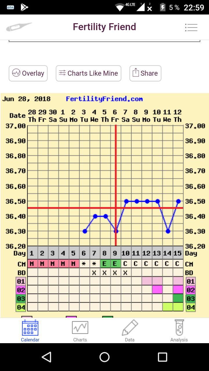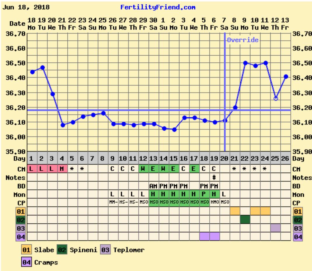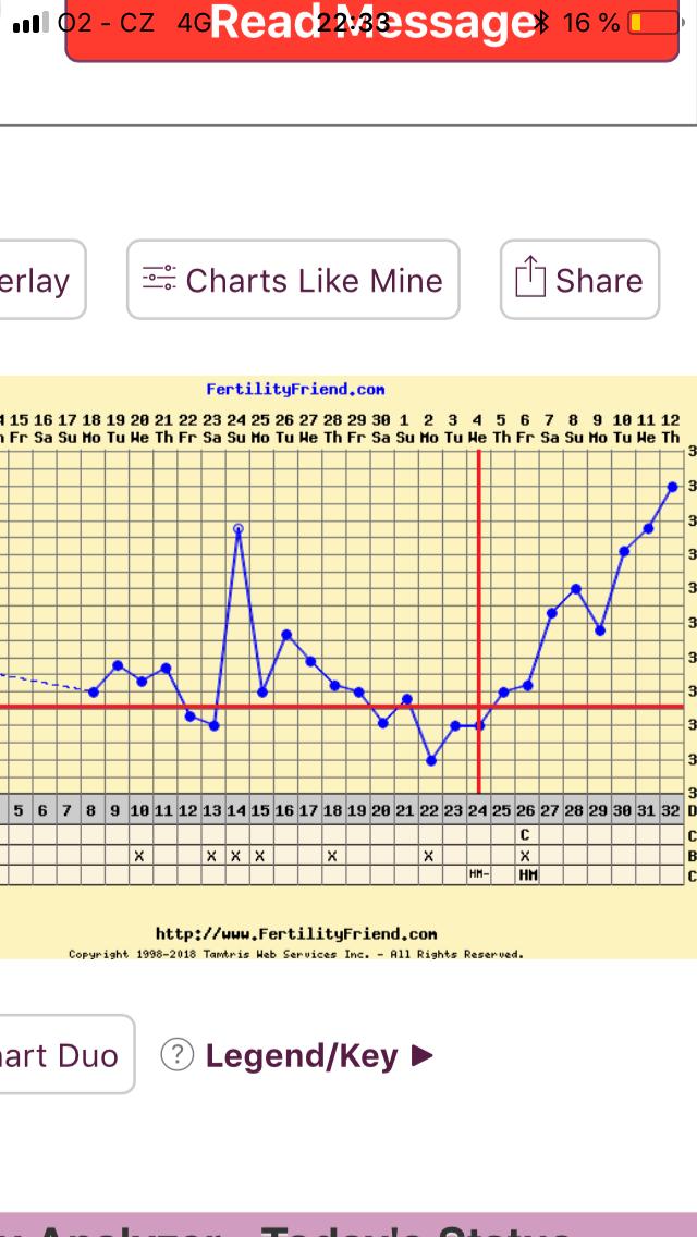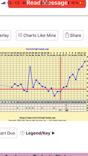 Holky já vám sem teda ten graf taky dám...dneska popolezla teplota zas o kousek nahoru, ale jsem si téměř jistá, že u mě je to spíš tím teploměrem. Doteď jsem měřila iFertrackerem a teď klasickým digitalem v puse. ☹ ovulka podle mě proběhla 19DC večer ( cítím jí) a ne až ten 20DC, co ukazuje graf. To krvácení je podle mě nedostatkem progesteronu, takže by se vajco určitě nezvládlo uhnízdit. Uvidíme, co řekne doktorka, no. Už jsem na cestě. Jinak jsem dneska cvičně zkusila test (poprvé v životě 😂) a samozřejmě ani prd. Ale vím, že je stejně ještě moc brzy, i kdyby uvnitř něco bylo.