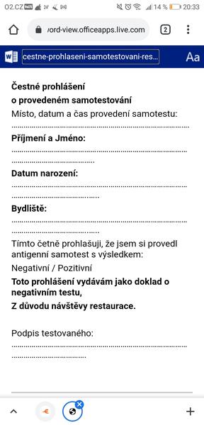 Jenomže čestné prohlášení vám PČR či hygiena uzná pouze v případě, že vám ho má kdo potvrdit - je tedy pouze pro zaměstnance a studenty, kteří nedostávají doklad o výsledku testu. Jelikož přesně jak tu bylo zmíněno, tohle by si mohl napsat každý, je o tom všude kvanta článků... Takže jo, my matky na mateřské máme celkem smůlu... Jinak ano, pořád platí samotest provedený před obsluhou restaurace (tedy opět nezaujatá osoba, která vám to potvrdí, že jste ho provedli)