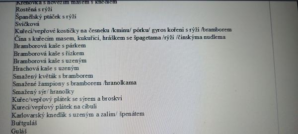 obed: deti maji v institucich, nam s muzem varim, obed ze soboty mame i na pondeli, z nedele na utery, pak jeden den v tydnu se uvari obed na dva dny (neco treba zapeceneho v troube), jeden den se treba vytahneme nejake zbytky z mrazaku, pres vikend varime na dva dny polevku (varim zeleninove-pres zimu spenatova, hraskova z mrazene zeleniny, porkova-mame ze zahrady, rajska s cervenou cockou - rajsky protlak z domacich rajcat, vyvar, pres leto mame cerstvy kvetak, brokolici-takze tyto v sezone), v sobotu se snazim varit neco lehciho a levnejsiho (, rajska,cocka, hrachova kase, livance, bramborovy gulas), v nedeli mame kure, rizky, gulas, maso na hribkach apod.) k tomu nejaky salat, kompot ci zelenina