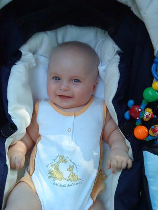 Ahoj holky! Evko, máš pravdu, poslední dobou to tady vázne. Ale co se mě týče, tak pokud počasí jenom trochu dá, trajdáme po venku, no ale je fakt, že jsem lenivá tady semo tamo napsat, tak se budu snažit to napravit. 😉 Náš malý nám teď nějak často kadil, někdy i 6 -7 krát za den. Tak jsme s ním byli u MUDr. na výtěr a dáváme mu mlíčko do odvaru z rýže, no, dneska zlepšení (už jen 4 stoličky), tak snad se to zlepší. Mudr. to svádí na zoubky, váhu má taky super - 9 700 g 😀 Tak asi to k tomu patří. Jinak s Michulí se občas potkáme, tak srovnáváme ty naše cvalíky 😀 Jak nám krásně rostou, že se skoro nevlezou do kočárku 😀 Co Koczurka? Nějak se neozývá. Přikládám nějaké nové fotečky a přeji všem příjemný víkendík!