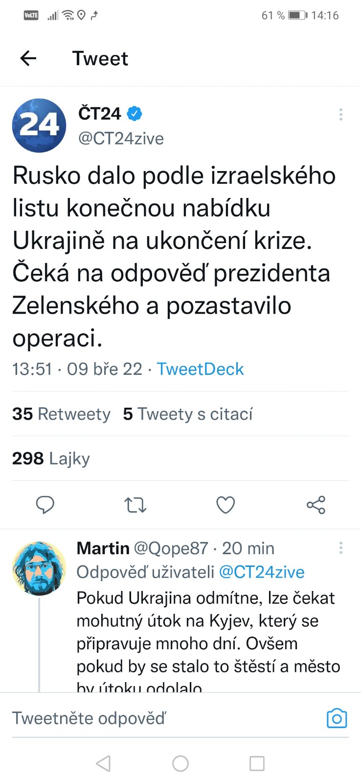 Teď jsme k odstranění Putina četla skvělý komentář ruského historika Andreje Zubova, podle kterého Putin padne když ne v nejbližších dnech, tak týdnech, podporuje ho spodní vrstva společnosti, ale ta je naučená být pasivní a zalezlá u televize, střední vrstva - inteligence, ho odsuzuje, ale někdy je ještě loajální kvůli práci ve státním sektoru, špičky společnosti 1-2 % těch nejbohatších, zapojených do světového byznysu, chtějí své jachty, vily na vinici v Toskánsku, chtějí zpět svůj sladký život, co budovali. Ale teď z nich dělá válečné zločince, kteří se bojí Haagu a nemůžou ke svým majetkům, řeší jediné, že je podvedl. Vyberou někoho ze svého středu, kdo ho nahradí. Nebude to nikdo spojený s armádou, nikdo poskvrněný současnými zločiny, aby se mohl dohodnout se Západem a tenhle sladký život jim vrátit. Co rozhodně nechtějí je jaderná apokalypsa. Nejsou to fanatici, nespojuje je nějaká vznešená myšlenka, ideologicky jsou vyprázdnění. Autor je optimista. Tak zkusím být taky. Tady je překlad jeho textu do polštiny, dnes jsem ho viděla kolovat někde na Twitteru i v angličtině.