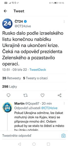 @pampeliska1313 ano, ten tajemný zdroj, kterému před začátkem války vlastně vše vyšlo, o tom stále mluví, ale člověk se teď už motá i v tom, že Putin může chtít, ať si to myslíme... Prostě strašně moc spekulací, ve kterých se člověk zamotá a už neví ani to, co je černé a co bílé.