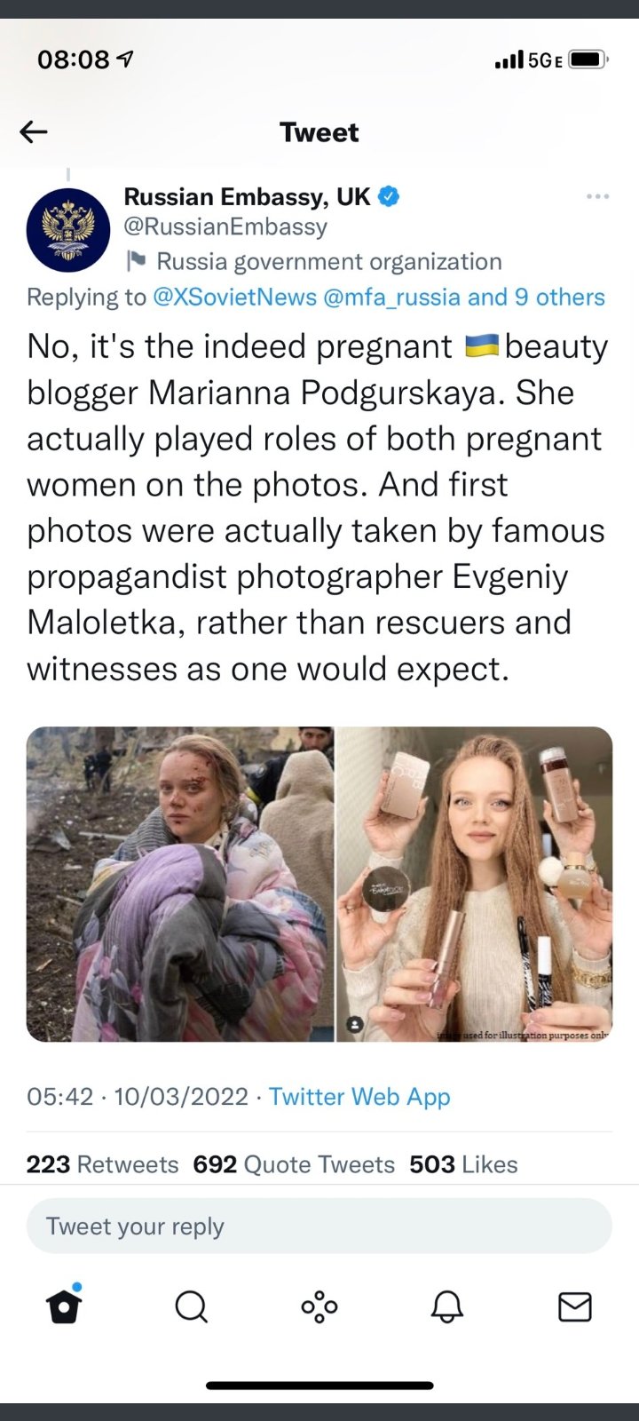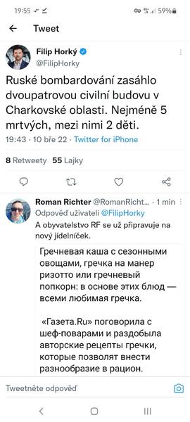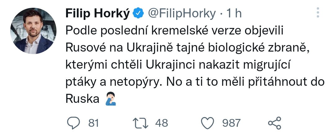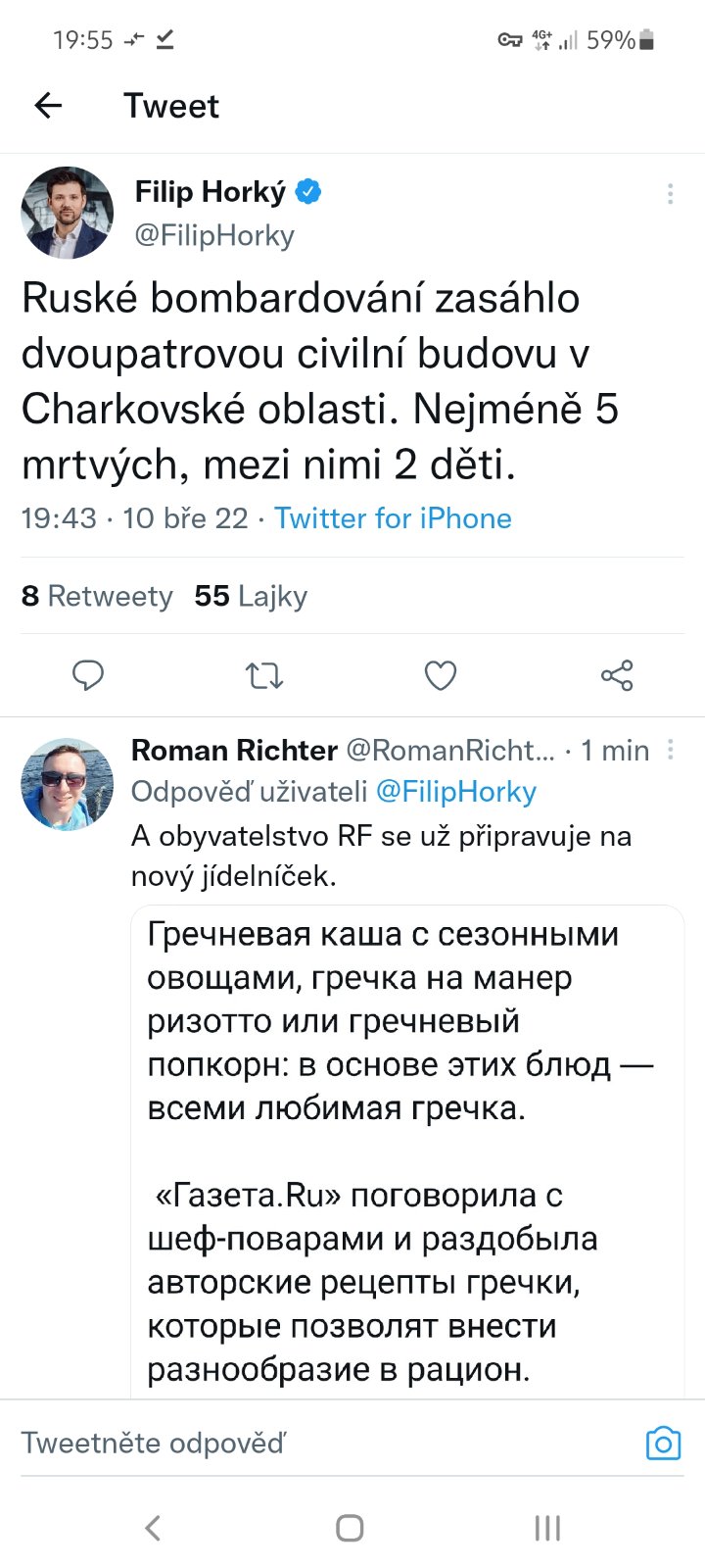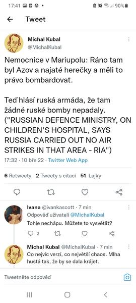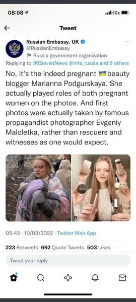 @simix22 hele, ja tady budu taky za dablova advokata. Ale presne to jsem si rikala. jsem se koukala na nejaky fotky z bombardovani nemocnice MSF v Kunduzu v Afghanistanu tu tenkrat vybombardovali USA, protoze - presne,afghanska vlada tvrdila, ze si tam udelal zakladnu Taliban. Pak to tedy jeste nekolikrat zmenili... ale to je vedlejsi. Kam mirim - ty fotky videt nechcete. Jednak vybombardovana nemocnice vypada porad jako nemocnice - jsou tam luzka, zarizeni, pristroje. Pak samozrejme fotky obeti (myslim i zranenych), je samozrejme mraky. a taky - videla jsem nejaky video jakoze z ty nemocnice z Mariupolu po tom bombardovani - a tam proste jako neni nic. Par posteli, ale ve smes stoly, zidle, nocni stolky. That's all. Zkusim to dohledat. Jako - NEDELAM si o Rusovi iluze, fakt ne. nic neschvaluju, nikoho se nezastavam, aby bylo jasno. pamatuju si, co delali v Syrii. Cetla jsem neco o jejich taktice utoku na civilni cile. Vim, ze lzou jako kdyz tiskne. Ale zrovna toto ... zrovna toto muze uplne klidne byt dilo propagandy z druhy strany (a nedelejme si iluze ze nejede na plny obratky... uz se tu i nekdo pozastavoval nad tim, ze neexistuji zpravy o zajatych ukrajincich, zniceny ukrajinsky technice atp., pritom logicky byt musi).... just sayin'.