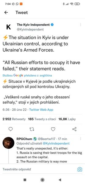 Za mě uzavírám dnešní zpravodajství. Teď v noci stejně nebudeme moc vědět, budou se objevovat zprávy o ostřelování jako každou noc. Držím palce Ukrajině, ať se naplní to, že země, která má ve znaku vidličku, prostě nemůže být poražena zemí, která má ve znaku kuře :D Přejme ji aspoň trochu klidnější noc.