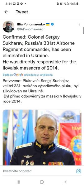 Plukovník Sergej Suchajev, velitel 331 výsadkového pluku byl zlikvidován na Ukrajině. Byl také přímo zodpovědný za masakr v Ilovajsku 2014.