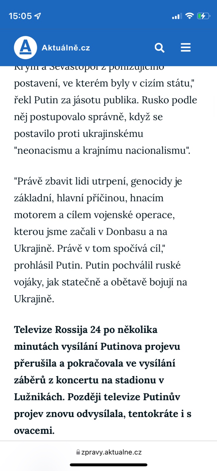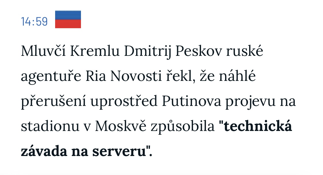 Ruská televize náhle přerušila vysílání Putinova projevu na stadionu v moskevských Lužnikách a pokračovala vysíláním vlasteneckého koncertu