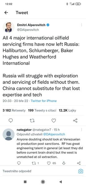 Twitter: Rusko opouští 4 hlavní ropné těžařské společnosti. Čína je v tuto chvíli neumí nahradit. Rusko bude mít tedy problém i s těžbou ropy.