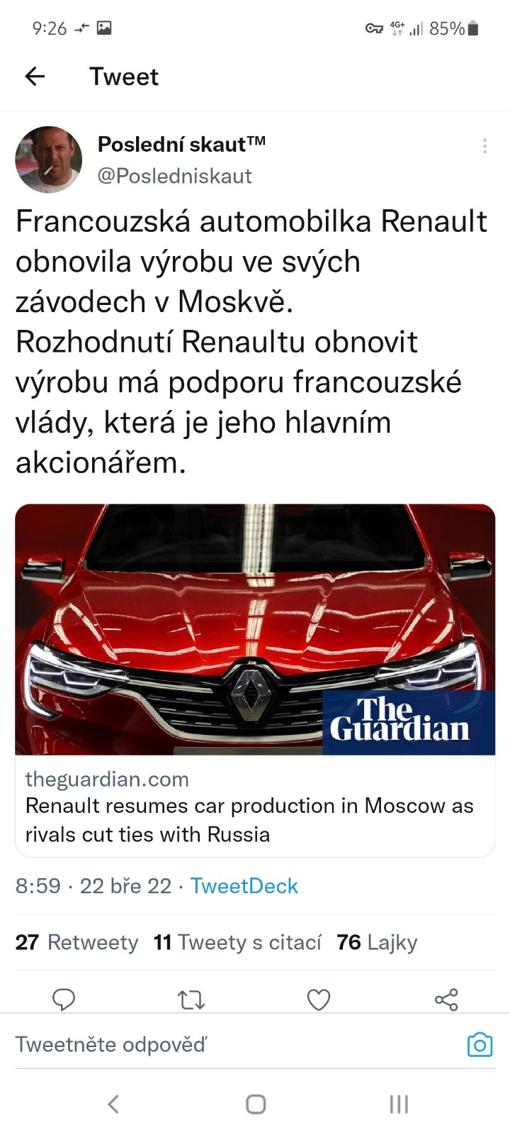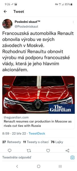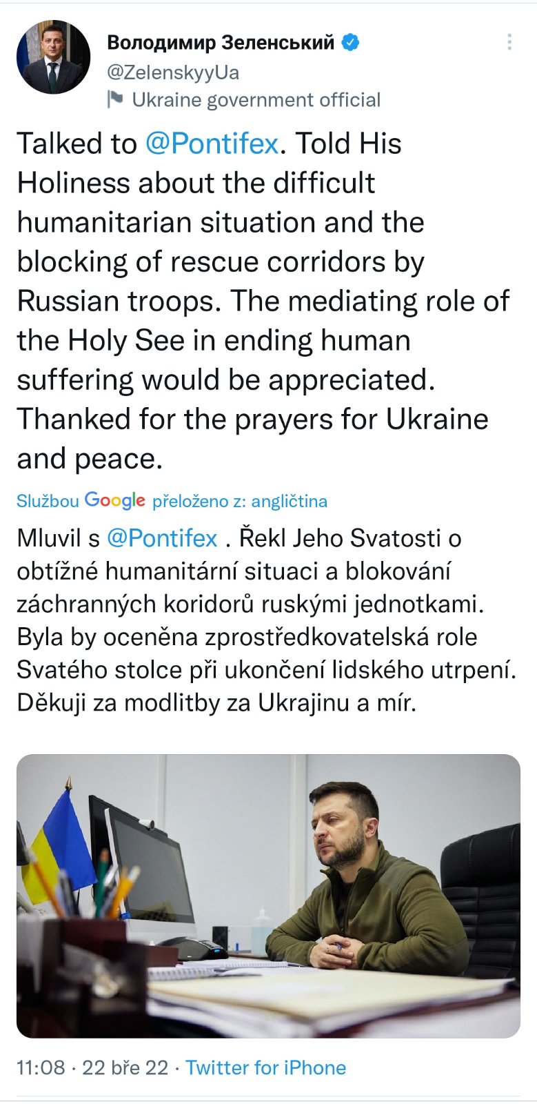 Včera jsem poslouchala rádio a zmiňoval tam Martin Dorazín taky jeden otřesný a silný příběh. Že se z Mariupolu podařilo uniknout jeho kamarádce se synem (včera), ale za tu cenu, že tam musela nechat nepohyblivé rodiče, bez jídla, bez pomoci. Úplně nechodící, někde, kde jsou schody. 😭 Jenže stejně není, proč někam chodit - nikde žádné jídlo, zásobování... Ti lidi tam už teď opravdu uvažují tak, že zůstat =100 % smrt, zatímco odjet = aspoň trochu naděje (on to tam přímo vyčíslil na nějakých 70% riziko smrti, jako že ta pravděpodobnost úniku není velká). Auto, které jelo za autem té kamarádky, prý najelo na minu a posádka už není... Úplně se mi udělalo mdlo, když jsem to poslouchala.