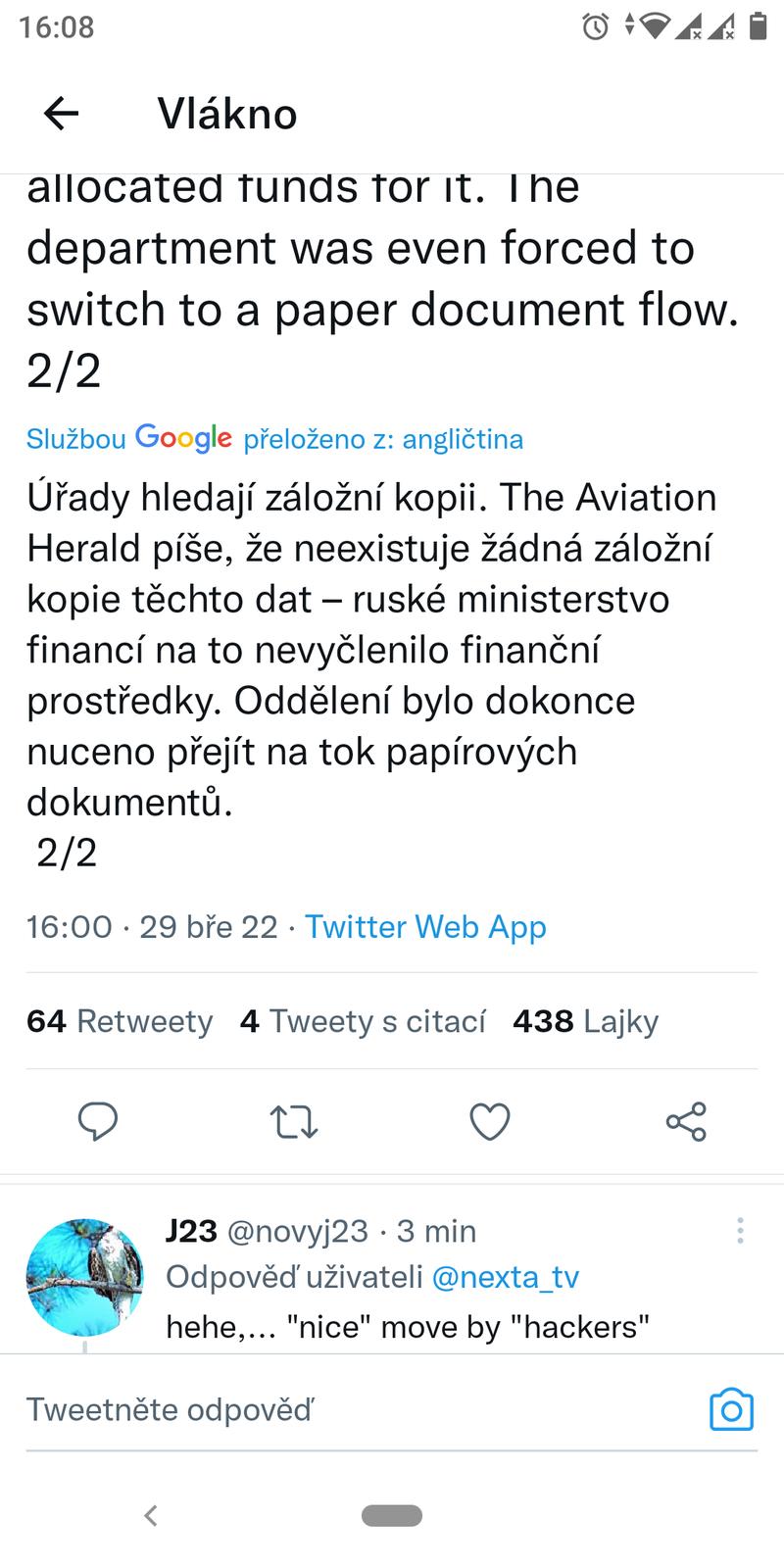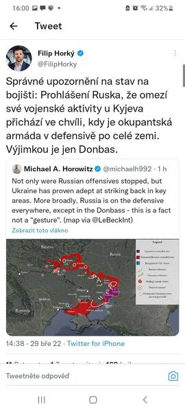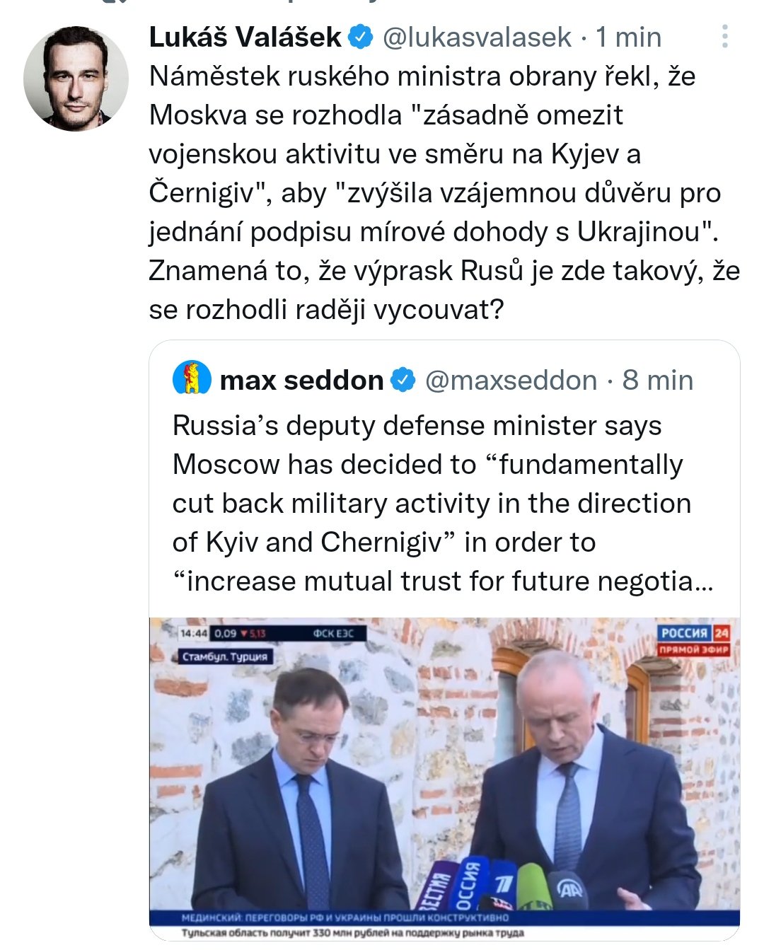 @zuzekk že se stahují zpět, většinou se stahují jednotky, které utrpěly značné ztráty, jak materiální, tak lidské. Takže asi dostali dost na zadek. Další možnost je, že opravdu upustili od plánu dobýt Kyjev, tak je stahují, a možná chtějí nasadit na Donbas, o kterém teď tvrdí, že byl stejně jediným, o co jim šlo.