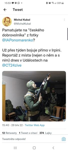 @psya Ja prave nevim, jestli psal, ze je primov Kyjeve, nebo u Kyjeva. Ale co daval fotky toho bytu, kde byli, tak tam mel hozenej bagl a to byl vzor maskace francouzsky cizinecky legie. Tenhle ma cesky termo pradlo, vestu poustni maskac anglanu, myslim. Kalhoty nerozeznam. Predpokladam, ze Cohen bude mit jeste vybavu z legie 😉😄