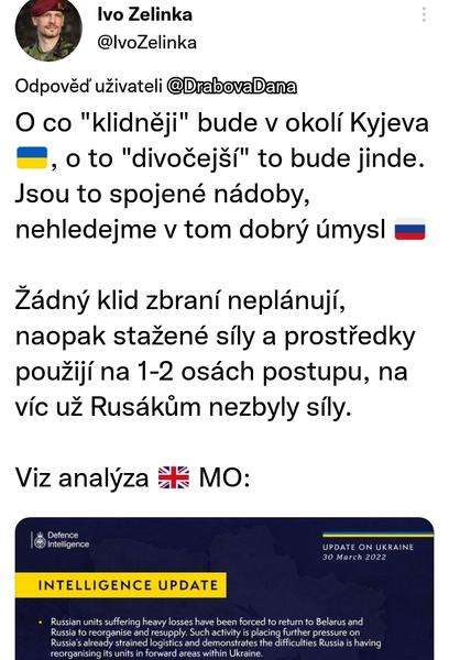 Mluvčí Pentagonu John Kirby dnes potvrdil, že od Kyjeva odjíždí malý počet ruských jednotek směrem na sever, Moskva je ale podle USA nestahuje z bojů, nýbrž přesouvá na jiná místa na Ukrajině, kde možná v blízké době chystá velkou ofenzivu.