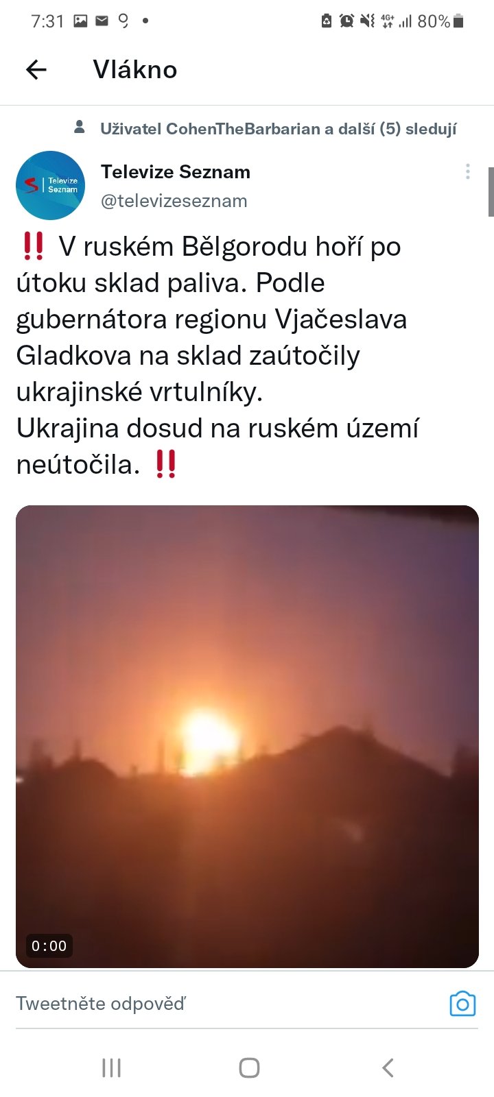 Státní agentura RIA Novosti píše, že v Bělgorodu hoří 8 nádrží z 16, požár se zatím nedaří zastavit.
