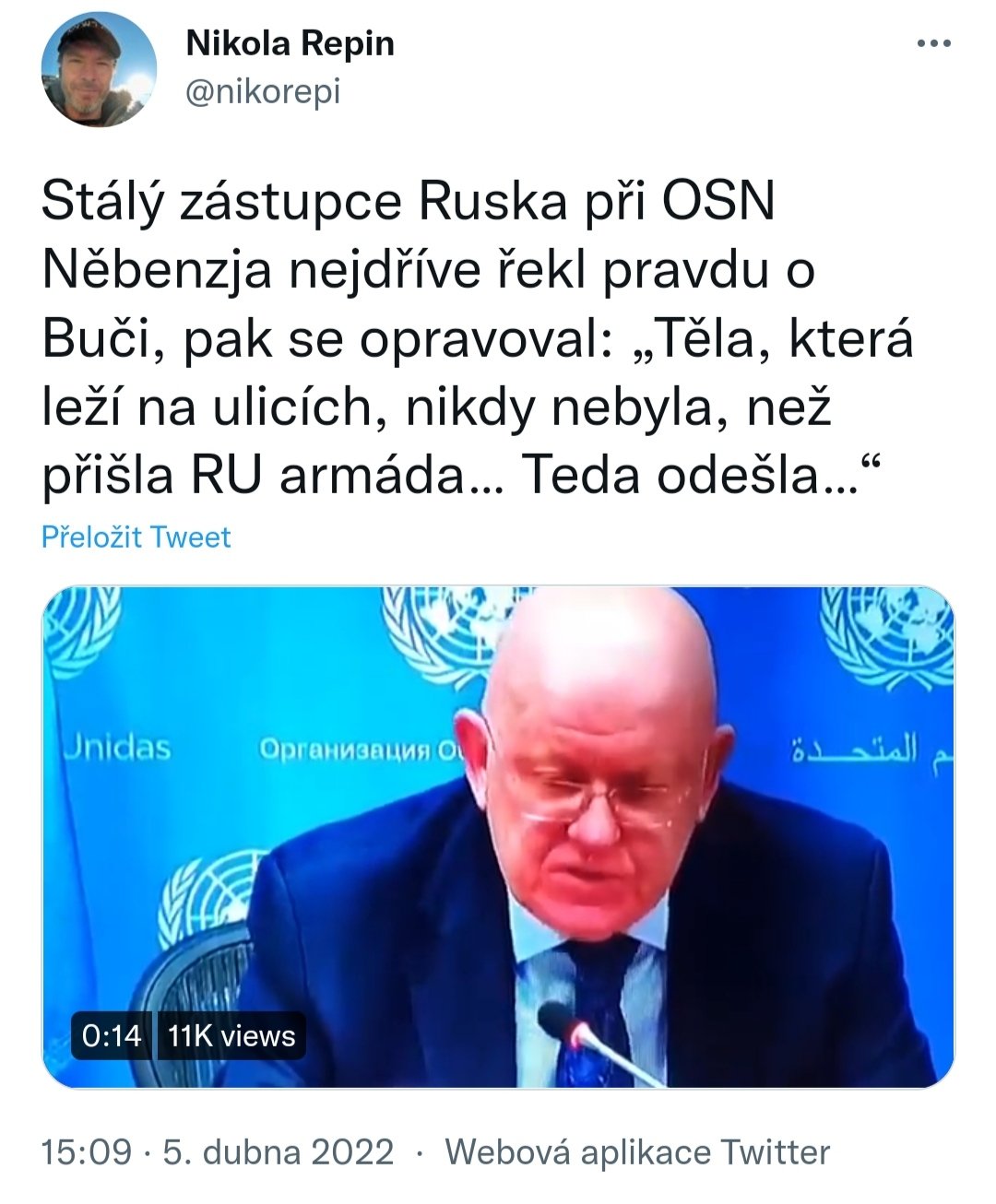 Další příspěvek Dmitrije Medvěděva. Stručně: Buča je součástí ukrajinských lží, Ukrajinci kvůli tomu klidně zabíjejí vlastní lidi. Řídí je Západ. Takoví Ukrajinci budou fyzicky zlikvidováni, protože Rusko buduje "otevřenou Eurasii od Lisabonu do Vladivostoku".