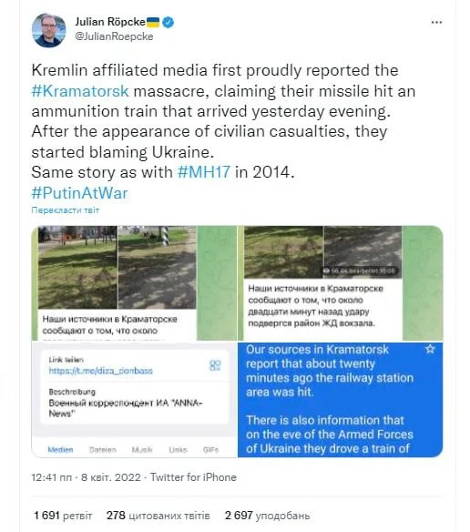- Ruská příručka o genocidě byla zveřejněna 3. dubna, dva dny po prvním odhalení, že ruští vojáci na Ukrajině zavraždili stovky lidí v Buči, to znamená, že program genocidy byl vědomě zveřejněn, i když se objevovaly fyzické důkazy genocidy, pro zveřejnění programu eliminace ukrajinského národa jako takového byl schválně zvolen tento okamžik