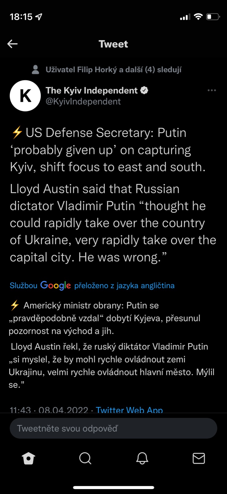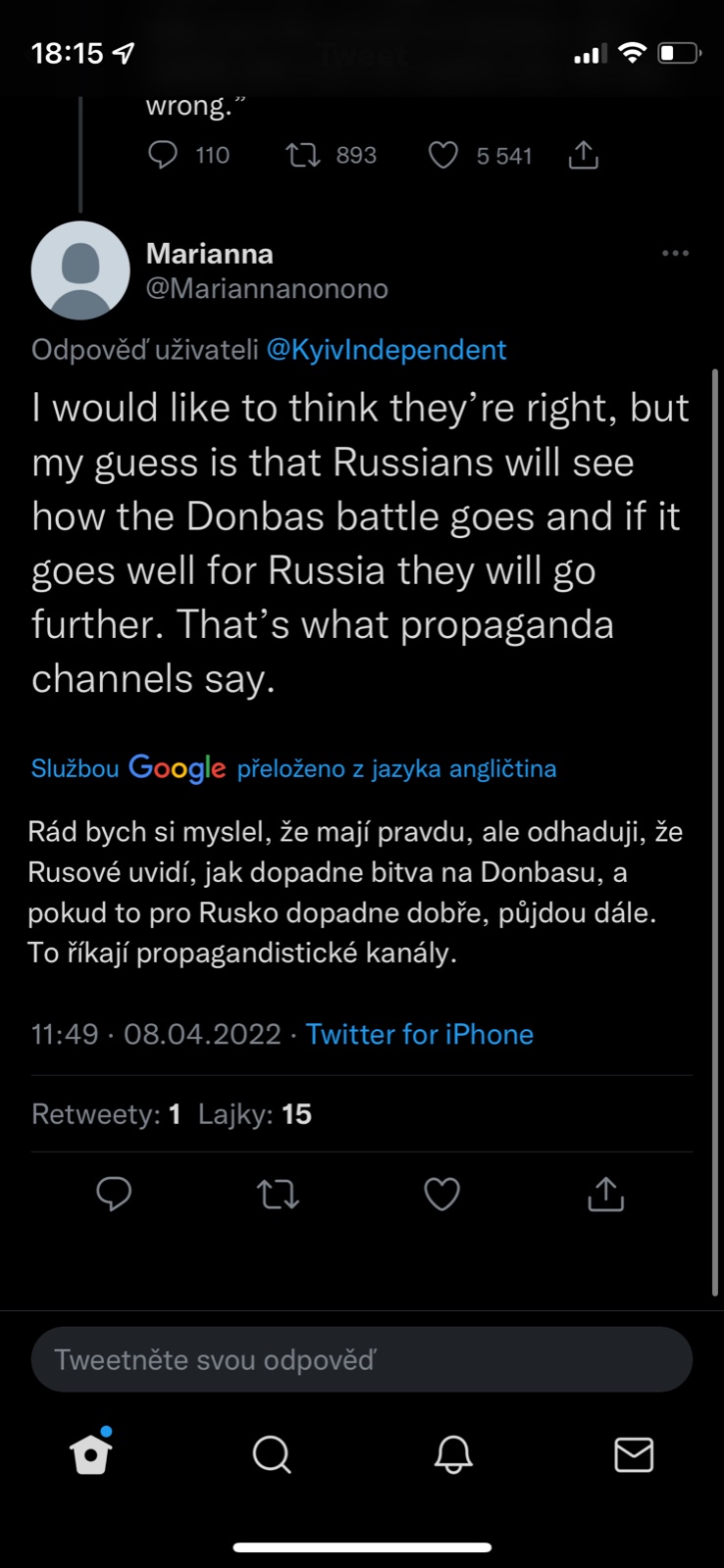 Paní na úklid - dům jejích rodičů v Borovjance u Cernihivu nestojí. Domy, byty jejích kamarádek, příbuzných nestojí. Je v ČR už dlouho, ale to, že se nebude mít kam vrátit... Když mi vyprávěla, jak utíkali známí, kterým pomáhala v Praze, rozplakala se. Máma, dvě děti 5 a 2r, "evakuují se" = ujíždí autem před střelbou a děti volají "Jeť autíčko, jeť, jeť rychleji, ať nás nepostřílí.."