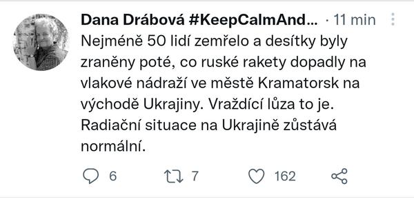 Přišla k nám nová učitelka z Doněcka, domlouváme rozvrh, že má ráno nějaké onliny. Ale vlastně že neví, jak to bude, protože celou její oblast vyzvali k masové evakuaci, její žáci se nebudou moct připojovat. Hrozně se o ně bojí. Co se děje s jejím a jejich domovem. Slzy v očích se jí objevily, když nám říkala o Kramatorskem masakru, přes práci jsem to nečetla. Bože, co jí člověk k tomu může říct?!?