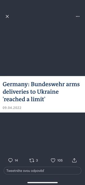 @sebestka no už asi nebudu posílat na ua a musí si zajistit zásoby i pro sebe, protože šli na strop. Někdo v komentářích zmiňoval, ze v podstatě je Německa armáda hodně podfinancovana za ty roky a ze se není čemu divit, ze už nemají asi co poslat a vyčerpali sklady